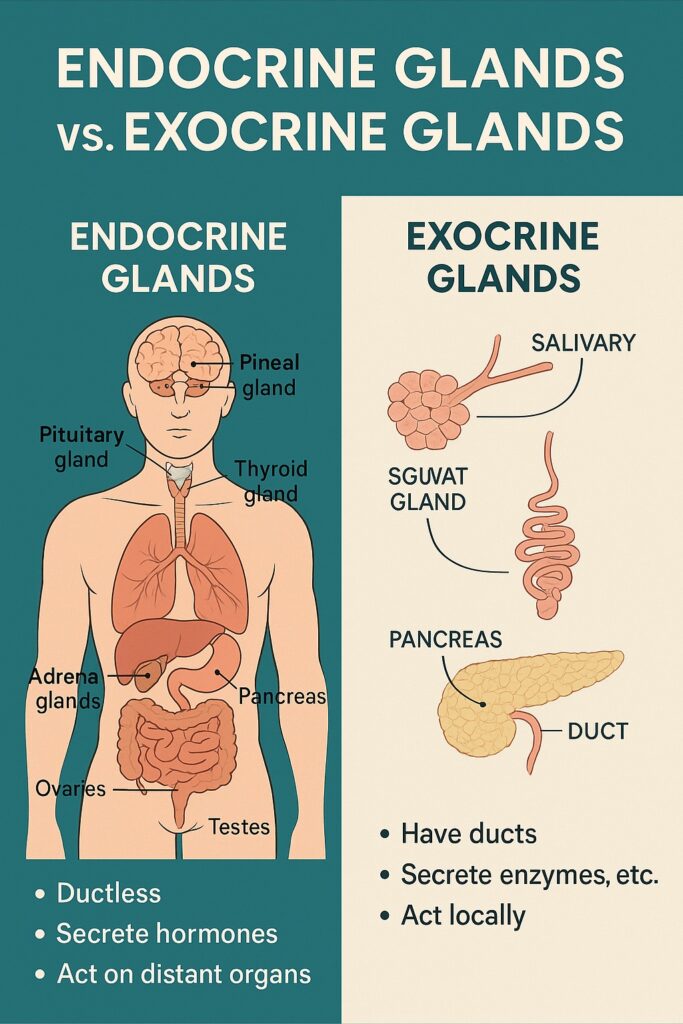 - Endocrine glands – ductless glands that release hormones directly into the bloodstream.